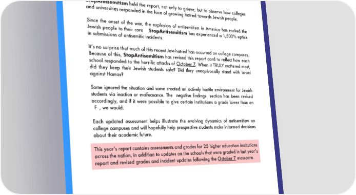 INTRODUCTION The 2023 “Antisemitism on U.S. College & University Campuses” Report Card was originally slated to be released on October 9. But when Hamas attacked Israel on October 7, we knew we had to wait. StopAntisemitism held the report, not only to grieve, but to observe how colleges and universities responded in the face of growing hatred towards Jewish people. Since the onset of the war, the explosion of antisemitism in America has rocked the Jewish people to their core — StopAntisemitism has experienced a 1,500% uptick in submissions of antisemitic incidents. Itʼs no surprise that much of this recent Jew-hatred has occurred on college campuses. Because of this, StopAntisemitism has revised this report card to reflect how each school responded to the horrific attacks of October 7. When it TRULY mattered most, did they keep their Jewish students safe? Did they unequivocally stand with Israel against Hamas? Some ignored the situation and some created an actively hostile environment for Jewish students via inaction or malfeasance. The “negative findings” section has been revised accordingly, and if it were possible to give certain institutions a grade lower than an “F”, we would. Each updated assessment helps illustrate the evolving dynamics of antisemitism on college campuses and will hopefully help prospective students make informed decisions about their academic future. This yearʼs report contains assessments and grades for 25 higher education institutions across the nation, in addition to updates on the schools that were graded in last yearʼs report and revised grades and incident updates following the October 7 massacre. 1