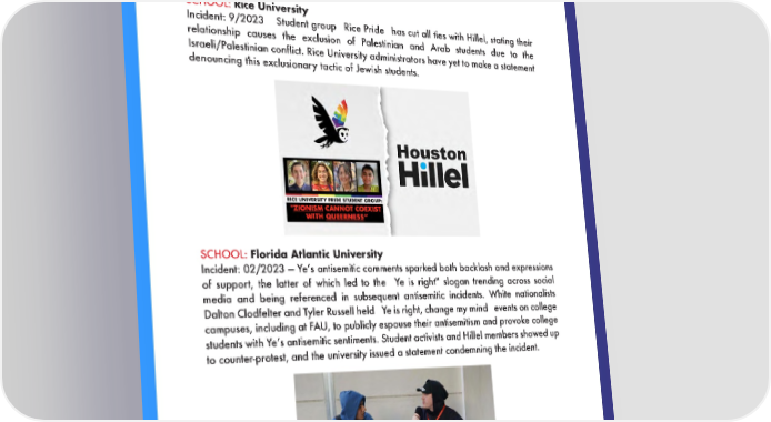 NEGATIVE FINDINGS The following are notable antisemitic incidents that have recently occurred on this year’s list of college campuses prior to October 7: SCHOOL: Rice University Incident: 9/2023 – Student group “Rice Pride” has cut all ties with Hillel, stating their relationship causes the exclusion of Palestinian and Arab students due to the Israeli/Palestinian conflict. Rice University administrators have yet to make a statement denouncing this exclusionary tactic of Jewish students. SCHOOL: Florida Atlantic University Incident: 02/2023 — Yeʼs antisemitic comments sparked both backlash and expressions of support, the latter of which led to the “Ye is right'' slogan trending across social media and being referenced in subsequent antisemitic incidents. White nationalists Dalton Clodfelter and Tyler Russell held “Ye is right, change my mind” events on college campuses, including at FAU, to publicly espouse their antisemitism and provoke college students with Yeʼs antisemitic sentiments. Student activists and Hillel members showed up to counter-protest, and the university issued a statement condemning the incident. 17