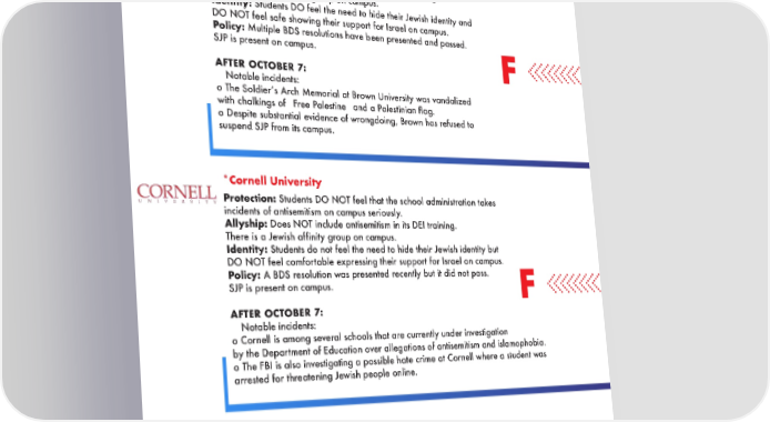 IVY LEAGUE & ADJACENT SCHOOLS Brown University Protection: Students DO NOT feel that the school administration takes incidents of antisemitism on campus seriously. Allyship: Does NOT include antisemitism in its DEI training. There is a Jewish affinity group on campus. Identity: Students DO feel the need to hide their Jewish identity and DO NOT feel safe showing their support for Israel on campus. Policy: Multiple BDS resolutions have been presented and passed. SJP is present on campus. F AFTER OCTOBER 7: • Notable incidents: o The Soldierʼs Arch Memorial at Brown University was vandalized with chalkings of “Free Palestine” and a Palestinian flag. o Despite substantial evidence of wrongdoing, Brown has refused to suspend SJP from its campus. *Cornell University Protection: Students DO NOT feel that the school administration takes incidents of antisemitism on campus seriously. Allyship: Does NOT include antisemitism in its DEI training. There is a Jewish affinity group on campus. Identity: Students do not feel the need to hide their Jewish identity but DO NOT feel comfortable expressing their support for Israel on campus. Policy: A BDS resolution was presented recently but it did not pass. SJP is present on campus. F AFTER OCTOBER 7: • Notable incidents: o Cornell is among several schools that are currently under investigation by the Department of Education over allegations of antisemitism and islamophobia. o The FBI is also investigating a possible hate crime at Cornell where a student was arrested for threatening Jewish people online. 7