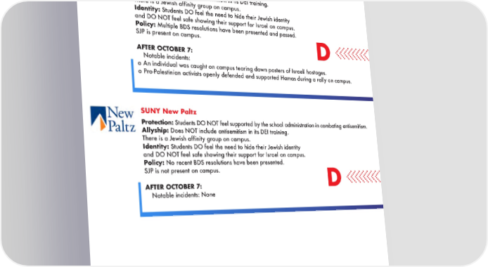 PUBLIC UNIVERSITIES | EAST University of Illinois Urbana Champaign Protection: Students feel that the school administration DOES NOT do enough to combat antisemitism on campus or support its Jewish population. The school DID participate in StopAntisemitismʼs survey. Allyship: DOES include antisemitism in its DEI training. There is a Jewish affinity group on campus. Identity: Students DO feel the need to hide their Jewish identity and DO NOT feel safe showing their support for Israel on campus. Policy: Multiple BDS resolutions have been presented and passed. SJP is present on campus. AFTER OCTOBER 7: D • Notable incidents: o An individual was caught on campus tearing down posters of Israeli hostages. o Pro-Palestinian activists openly defended and supported Hamas during a rally on campus. SUNY New Paltz Protection: Students DO NOT feel supported by the school administration in combating antisemitism. Allyship: Does NOT include antisemitism in its DEI training. There is a Jewish affinity group on campus. Identity: Students DO feel the need to hide their Jewish identity and DO NOT feel safe showing their support for Israel on campus. Policy: No recent BDS resolutions have been presented. SJP is not present on campus. D AFTER OCTOBER 7: • Notable incidents: None 13
