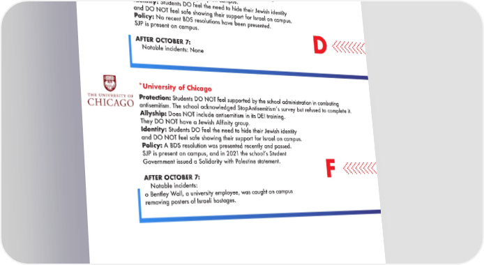 PRIVATE UNIVERSITIES Georgetown University Protection: Students DO NOT feel supported by the school administration and feel like the school DOES NOT do enough to combat antisemitism. Allyship: Does NOT include antisemitism in its DEI training. There is a Jewish affinity group on campus. Identity: Students DO feel the need to hide their Jewish identity and DO NOT feel safe showing their support for Israel on campus. Policy: No recent BDS resolutions have been presented. SJP is present on campus. AFTER OCTOBER 7: D • Notable incidents: None *University of Chicago Protection: Students DO NOT feel supported by the school administration in combating antisemitism. The school acknowledged StopAntisemitismʼs survey but refused to complete it. Allyship: Does NOT include antisemitism in its DEI training. They DO NOT have a Jewish Affinity group. Identity: Students DO feel the need to hide their Jewish identity and DO NOT feel safe showing their support for Israel on campus. Policy: A BDS resolution was presented recently and passed. SJP is present on campus, and in 2021 the schoolʼs Student Government issued a Solidarity with Palestine statement. F AFTER OCTOBER 7: • Notable incidents: o Bentley Wall, a university employee, was caught on campus removing posters of Israeli hostages. 11