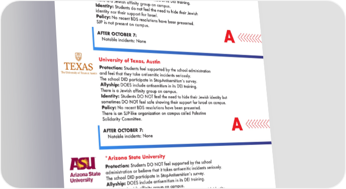 PUBLIC UNIVERSITIES | WEST University of Colorado, Boulder Protection: Students feel that the school administration DOES support them in combating antisemitism on campus. The school DID participate in StopAntisemitismʼs survey. Allyship: DOES include antisemitism in its DEI training. There is a Jewish affinity group on campus. Identity: Students do not feel the need to hide their Jewish identity nor their support for Israel. Policy: No recent BDS resolutions have been presented. SJP is not present on campus. A AFTER OCTOBER 7: • Notable incidents: None University of Texas, Austin Protection: Students feel supported by the school administration and feel that they take antisemitic incidents seriously. The school DID participate in StopAntisemitismʼs survey. Allyship: DOES include antisemitism in its DEI training. There is a Jewish affinity group on campus. Identity: Students DO NOT feel the need to hide their Jewish identity but sometimes DO NOT feel safe showing their support for Israel on campus. Policy: No recent BDS resolutions have been presented. There is an SJP-like organization on campus called Palestine Solidarity Committee. AFTER OCTOBER 7: A • Notable incidents: None *Arizona State University Protection: Students DO NOT feel supported by the school administration or believe that it takes antisemitic incidents seriously. The school DID participate in StopAntisemitismʼs survey. Allyship: DOES include antisemitism in its DEI training. There is a Jewish affinity group on campus. Identity: Students do not feel the need to hide their Jewish identity but often DO NOT feel safe showing their support for Israel on campus. Policy: Recent BDS resolutions were presented but did NOT pass. SJP is present on campus. A AFTER OCTOBER 7: • Notable incidents: o Rocks were thrown outside a student government meeting at the schoolʼs campus in Tempe. This incident is currently under investigation by the Arizona State University Police Department. 14