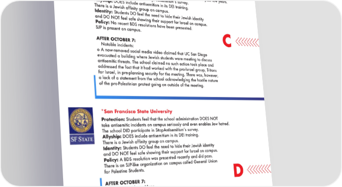 PUBLIC UNIVERSITIES | WEST *University of California, San Diego Protection: Students DO NOT feel supported by school administration and reports of antisemitism on campus are not handled well. Multiple antisemitic incidents have occurred at this school over the past few years. The school DID participate in StopAntisemitismʼs survey. Allyship: DOES include antisemitism in its DEI training. There is a Jewish affinity group on campus. Identity: Students DO feel the need to hide their Jewish identity and DO NOT feel safe showing their support for Israel on campus. Policy: No recent BDS resolutions have been presented. SJP is present on campus. C AFTER OCTOBER 7: • Notable incidents: o A now-removed social media video claimed that UC San Diego evacuated a building where Jewish students were meeting to discuss antisemitic threats. The school claimed no such action took place and addressed the fact that it had worked with the pro-Israel group, Tritons for Israel, in pre-planning security for the meeting. There was, however, a lack of a statement from the school acknowledging the hostile nature of the pro-Palestinian protest going on outside of the meeting. *San Francisco State University Protection: Students feel that the school administration DOES NOT take antisemitic incidents on campus seriously and even enables Jew hatred. The school DID participate in StopAntisemitismʼs survey. Allyship: DOES include antisemitism in its DEI training. There is a Jewish affinity group on campus. Identity: Students DO feel the need to hide their Jewish identity and DO NOT feel safe showing their support for Israel on campus. Policy: A BDS resolution was presented recently and did pass. There is an SJP-like organization on campus called General Union for Palestine Students. D AFTER OCTOBER 7: • Notable incidents: None 15
