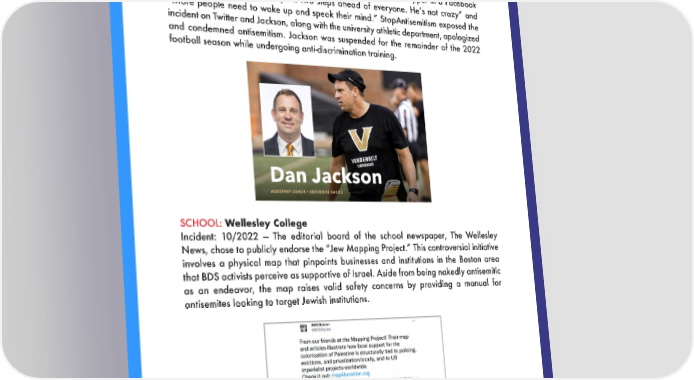 NEGATIVE FINDINGS SCHOOL: Vanderbilt University Incident: 11/2022 — Shortly after Yeʼs antisemitic comments in the fall of 2022, Vanderbilt assistant football coach Dan Jackson was caught defending the rapper in a Facebook thread. Jackson wrote, “Kanye is two steps ahead of everyone. Heʼs not crazy” and “More people need to wake up and speak their mind.” StopAntisemitism exposed the incident on Twitter and Jackson, along with the university athletic department, apologized and condemned antisemitism. Jackson was suspended for the remainder of the 2022 football season while undergoing anti-discrimination training. SCHOOL: Wellesley College Incident: 10/2022 — The editorial board of the school newspaper, The Wellesley News, chose to publicly endorse the “Jew Mapping Project.” This controversial initiative involves a physical map that pinpoints businesses and institutions in the Boston area that BDS activists perceive as supportive of Israel. Aside from being nakedly antisemitic as an endeavor, the map raises valid safety concerns by providing a manual for antisemites looking to target Jewish institutions. 18