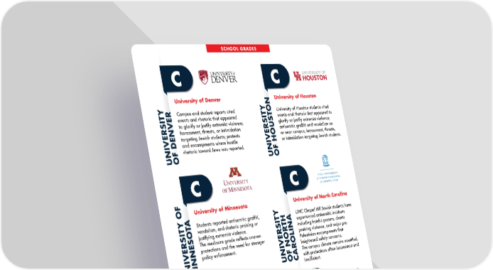 University of Denver Campus and student reports cited events and rhetoric that appeared to glorify or justify extremist violence; harassment, threats, or intimidation targeting Jewish students; protests and encampments where hostile rhetoric toward Jews was reported. C UNIVERSITY OF DENVER University of Southern California At USC, Jewish students have faced antisemitic incidents like swastika graffiti, and while the administration has condemned these acts and launched initiatives, protections remain inconsistent, leaving the campus climate only moderately safe. C UNIVERSITY OF SOUTHERN CALIFORNIA University of Minnesota Students reported antisemitic graffiti, vandalism, and rhetoric praising or justifying extremist violence. The mediocre grade reflects uneven protections and the need for stronger policy enforcement. C UNIVERSITY OF MINNESOTA University of Houston University of Houston students cited events and rhetoric that appeared to glorify or justify extremist violence; antisemitic graffiti and vandalism on or near campus; harassment, threats, or intimidation targeting Jewish students. C UNIVERSITY OF HOUSTON University of Vermont A January 2025 letter from a U of Vermont student described feeling unsafe: avoiding wearing a Star of David, altering travel on campus, and fearing speaking Hebrew. The underlying sense of risk among Jewish students remains, and many feel the protections and response mechanisms are still not fully reliable. C UNIVERSITY OF VERMONT University of North Carolina UNC Chapel Hill Jewish students have experienced antisemitic incidents including hateful posters, chants praising violence, and major pro Palestinian encampments that heightened safety concerns. The campus climate remains unsettled, with protections often inconsistent and insufficient. C UNIVERSITY OF NORTH CAROLINA SCHOOL GRADES
