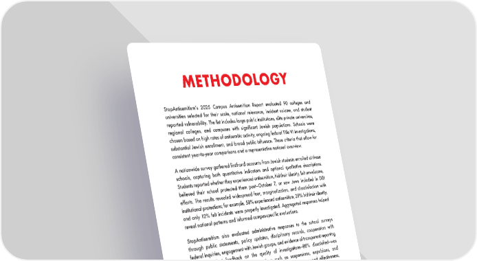 StopAntisemitismʼs 2025 Campus Antisemitism Report evaluated 90 colleges and universities selected for their scale, national relevance, incident volume, and student reported vulnerability. The list includes large public institutions, elite private universities, regional colleges, and campuses with significant Jewish populations. Schools were chosen based on high rates of antisemitic activity, ongoing federal Title VI investigations, substantial Jewish enrollment, and broad public influence. These criteria that allow for consistent year-to-year comparisons and a representative national overview. A nationwide survey gathered firsthand accounts from Jewish students enrolled at these schools, capturing both quantitative indicators and optional qualitative descriptions. Students reported whether they experienced antisemitism, hid their identity, felt unwelcome, believed their school protected them post–October 7, or saw Jews included in DEI efforts. The results revealed widespread fear, marginalization, and dissatisfaction with institutional protections; for example, 58% experienced antisemitism, 39% hid their identity, and only 12% felt incidents were properly investigated. Aggregated responses helped reveal national patterns and informed campus-specific evaluations. StopAntisemitism also evaluated administrative responses to the school surveys through public statements, policy updates, disciplinary records, cooperation with federal inquiries, engagement with Jewish groups, and evidence of transparent reporting systems. Student feedback on the quality of investigations—88% dissatisfied—was cross-referenced with documented actions such as suspensions, expulsions, and task-force creation. Administrations were evaluated for consistency, speed, effectiveness, and adherence to civil-rights obligations. Finally, the report tracked and verified hundreds of incidents across the 90 campuses, including harassment, vandalism, threats, encampments, faculty misconduct, and administrative failures. These were sourced from student submissions, media reports, police logs, federal findings, social media, and campus organizations, with every incident confirmed through at least one public or institutional source. Patterns of repeat or severe misconduct received additional weight. Each schoolʼs grade reflected incident volume and severity, administrative response quality, student-reported safety, presence of federal investigations, and evidence of accountability or neglect, providing a comprehensive and multi-layered assessment. METHODOLOGY
