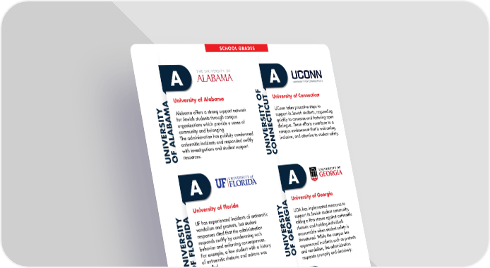 University of Alabama Alabama offers a strong support network for Jewish students through campus organizations which provide a sense of community and belonging. The administration has publicly condemned antisemitic incidents and responded swiftly with investigations and student support resources. A UNIVERSITY OF ALABAMA University of Miami U Miami takes a proactive approach to addressing antisemitism, prioritizing the safety and inclusion of its students. Jewish students consistently report feeling supported by the administration in matters of antisemitism and campus involvement. A UNIVERSITY OF MIAMI University of Florida UF has experienced incidents of antisemitic vandalism and protests, but student responses cited that the administration responds swiftly by condemning such behavior and enforcing consequences. For example, a law student with a history of antisemitic rhetoric and actions was expelled. A UNIVERSITY OF FLORIDA University of Connecticut UConn takes proactive steps to support its Jewish students, responding quickly to concerns and fostering open dialogue. These efforts contribute to a campus environment that is welcoming, inclusive, and attentive to student safety. A UNIVERSITY OF CONNECTICUT University of Mississippi Ole Miss administration takes reports of antisemitism seriously and responds to incidents promptly, reflecting a commitment to creating a safer and more welcoming environment for the Jewish student community. A UNIVERSITY OF MISSISSIPPI University of Georgia UGA has implemented measures to support its Jewish student community, taking a firm stance against antisemitic rhetoric and holding individuals accountable when student safety is threatened. While the campus has experienced incidents such as protests and vandalism, the administration responds promptly and decisively. A UNIVERSITY OF GEORGIA SCHOOL GRADES