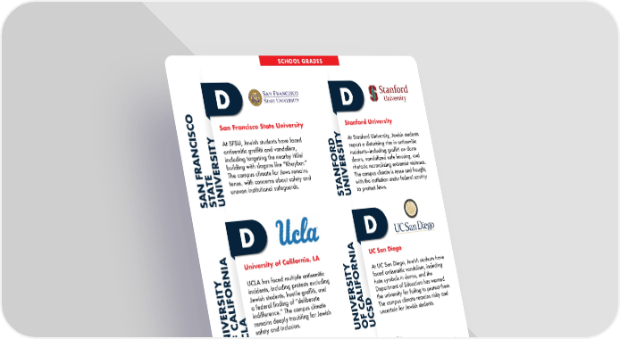 San Francisco State University At SFSU, Jewish students have faced antisemitic graffiti and vandalism, including targeting the nearby Hillel building with slogans like “Khaybar.” The campus climate for Jews remains tense, with concerns about safety and uneven institutional safeguards. D SAN FRANCISCO STATE UNIVERSITY UC Santa Cruz UCSC Jewish students have faced antisemitic incidents including swastika graffiti, flyers with hate speech, and a party celebrating Adolf Hitlerʼs birthday. The campus climate therefore remains unsafe for Jews, despite public condemnations. D University of California, LA UCLA has faced multiple antisemitic incidents, including protests excluding Jewish students, hostile graffiti, and a federal finding of “deliberate indifference.” The campus climate remains deeply troubling for Jewish safety and inclusion. D UNIVERSITY OF CALIFORNIA UCLA UNIVERSITY OF CALIFORNIA UCSC Stanford University At Stanford University, Jewish students report a disturbing rise in antisemitic incidents—including graffiti on dorm doors, vandalized safe housing, and rhetoric normalizing extremist violence. The campus climate is tense and fraught, with the institution under federal scrutiny to protect Jews. D STANFORD UNIVERSITY University of Chicago Jewish students at U Chicago reported antisemitic incidents, including vandalism and offensive signage in faculty offices. While the administration has investigated and provided bias-reporting resources, the campus climate remains tense and administrative responses are seen as insufficient. D UNIVERSITY OF CHICAGO UC San Diego At UC San Diego, Jewish students have faced antisemitic vandalism, including hate symbols in dorms, and the Department of Education has warned the university for failing to protect them. The campus climate remains risky and uncertain for Jewish students. D UNIVERSITY OF CALIFORNIA UCSD SCHOOL GRADES