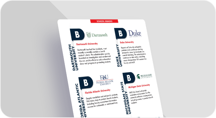 Dartmouth University Dartmouth has had few incidents, most recently a swastika outside a Jewish studentʼs dorm. The administration quickly launched an investigation and condemned the act, and its efforts to curb antisemitism show real progress in protecting students. B DARTMOUTH UNIVERSITY Muhlenberg College Reports cited varying levels of satisfaction with Muhlenbergʼs handling of antisemitic incidents, but a general sense of well-being among Jewish students. Most recently, a professor was fired from Muhlenberg over antisemitic rhetoric. B MUHLENBERG COLLEGE Florida Atlantic University Despite vandalism and antisemitic protests, FAU takes steps to protect Jewish students, including faculty committees that review courses for antisemitic or anti-Israel bias. B FLORIDA ATLANTIC UNIVERSITY Duke University Reports at Duke cite antisemitic protests and a professor sharing antisemitic views, but incidents are overall declining. The administration continues to take action, including recent Antisemitism 101 sessions for faculty and staff. B DUKE UNIVERSITY Pennsylvania State University Penn Stateʼs Jewish students have mixed views on the administrationʼs response to antisemitism, but most feel safe and supported, with the university taking steps to maintain an inclusive environment. B PENNSYLVANIA STATE UNIVERSITY Michigan State University MSU has faced antisemitic vandalism and protests, but the university enforces consequences, including arrests, to protect Jewish students. B MICHIGAN STATE UNIVERSITY SCHOOL GRADES