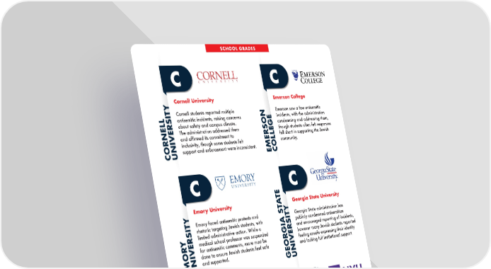 Cornell University Cornell students reported multiple antisemitic incidents, raising concerns about safety and campus climate. The administration addressed them and affirmed its commitment to inclusivity, though some students felt support and enforcement were inconsistent. C CORNELL UNIVERSITY Hofstra University Some Hofstra Jewish students feel cautious expressing their identity and not fully supported, despite active Jewish organizations offering community and resources. C HOFSTRA UNIVERSITY Emory University Emory faced antisemitic protests and rhetoric targeting Jewish students, with limited administrative action. While a medical school professor was suspended for antisemitic comments, more must be done to ensure Jewish students feel safe and supported. C EMORY UNIVERSITY Emerson College Emerson saw a few antisemitic incidents, with the administration condemning and addressing them, though students often felt responses fell short in supporting the Jewish community. C EMERSON COLLEGE New York University (NYU) NYU saw numerous antisemitic incidents and protests, raising concerns about safety and campus climate. The administration condemned antisemitism and took some action, though responses were seen as inconsistent by some students. C NEW YORK UNIVERSITY Georgia State University Georgia State administration has publicly condemned antisemitism and encouraged reporting of incidents, however many Jewish students reported feeling unsafe expressing their identity and lacking full institutional support. C GEORGIA STATE UNIVERSITY SCHOOL GRADES