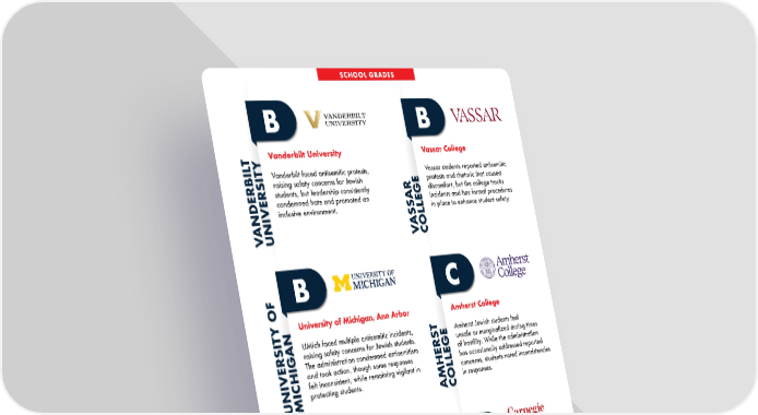 Vanderbilt University Vanderbilt faced antisemitic protests, raising safety concerns for Jewish students, but leadership consistently condemned hate and promoted an inclusive environment. B VANDERBILT UNIVERSITY Bard College Bard students experienced several antisemitic incidents and protests during the review period, contributing to concerns among Jewish students about safety and inclusion. Students expressed a need for stronger institutional measures to combat antisemitism effectively. C BARD COLLEGE University of Michigan, Ann Arbor UMich faced multiple antisemitic incidents, raising safety concerns for Jewish students. The administration condemned antisemitism and took action, though some responses felt inconsistent, while remaining vigilant in protecting students. B UNIVERSITY OF MICHIGAN Vassar College Vassar students reported antisemitic protests and rhetoric that caused discomfort, but the college tracks incidents and has formal procedures in place to enhance student safety. B VASSAR COLLEGE Carnegie Mellon University Carnegie Mellon Jewish students reported varying levels of concern about their safety and inclusion on campus. While the administration addressed some reported incidents, students noted inconsistent responses and a perception that antisemitism was not always taken seriously. C CARNEGIE MELLON UNIVERSITY Amherst College Amherst Jewish students feel unsafe or marginalized during times of hostility. While the administration has occasionally addressed reported concerns, students noted inconsistencies in responses. C AMHERST COLLEGE SCHOOL GRADES