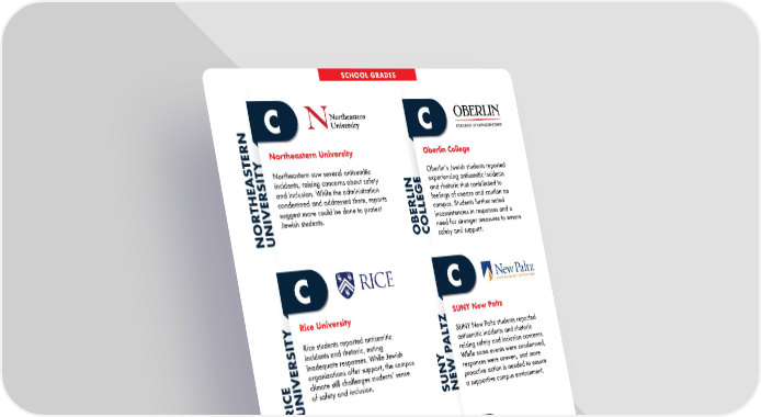 Northeastern University Northeastern saw several antisemitic incidents, raising concerns about safety and inclusion. While the administration condemned and addressed them, reports suggest more could be done to protect Jewish students. C NORTHEASTERN UNIVERSITY Swarthmore College Swarthmore students reported antisemitic graffiti, vandalism, and rhetoric glorifying extremist violence. The mid-range grade reflects uneven protections and the need for clearer policy enforcement. C SWARTHMORE COLLEGE Rice University Rice students reported antisemitic incidents and rhetoric, noting inadequate responses. While Jewish organizations offer support, the campus climate still challenges studentsʼ sense of safety and inclusion. C RICE UNIVERSITY Oberlin College Oberlinʼs Jewish students reported experiencing antisemitic incidents and rhetoric that contributed to feelings of unease and caution on campus. Students further noted inconsistencies in responses and a need for stronger measures to ensure safety and support. C OBERLIN COLLEGE Temple University Temple students reported antisemitic graffiti, vandalism, and rhetoric that seemed to endorse extremist violence. The mediocre grade reflects inconsistent protections and the need for clearer policy enforcement. C TEMPLE UNIVERSITY SUNY New Paltz SUNY New Paltz students reported antisemitic incidents and rhetoric raising safety and inclusion concerns. While some events were condemned, responses were uneven, and more proactive action is needed to ensure a supportive campus environment. C SUNY NEW PALTZ SCHOOL GRADES
