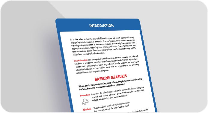INTRODUCTION At a time when antisemites are emboldened to spew anti-Jewish bigotry and openly engage in protests resulting in antisemitic violence, this report is an essential resource for exposing rising antisemitism at American universities and can help Jewish parents make appropriate decisions regarding their childrenʼs education. Jewish families must now take a stand and decide if they are willing to have their hard-earned money, paid for tuition fees, be used to fund antisemitism. StopAntisemitism sent surveys to the administrations, amassed research, and collected hundreds of first-person narratives by students at these schools. This new report offers a “report card” grading system based on pre-defined baseline measures that ranks higher education institutions on how well or poorly they are responding to, and preventing, antisemitism on their respective campuses. BASELINE MEASURES When analyzing and grading each school, StopAntisemitism adhered to various baseline measures under four categories: Protection: How does the school report antisemitic incidents? Is there a willingness to work with Jewish advocacy groups? What are the reactions from college administrators after an incident occurs? Allyship: Does the school speak out against antisemitism? Are Jews included in the schoolʼs DEI policies? Identity: Do Jewish students feel safe at their school? Do Jewish students feel the need to hide their identity on campus? Do Jewish students feel like they are being held responsible for Israelʼs actions? Policy: Has the school adopted the International Holocaust Remembrance Allianceʼs (IHRA) definition of antisemitism? Is there a Students for Justice in Palestine (SJP) organization on campus? Have BDS resolutions been adopted? Unless specified, all schools have an SJP (or similar) chapter, allow an Israeli Apartheid Week, and have not adopted IHRA. Additionally, only the school administrations which acknowledged the survey are notated. *Schools marked with an asterisk have had multiple antisemitic incidents in recent years. 3