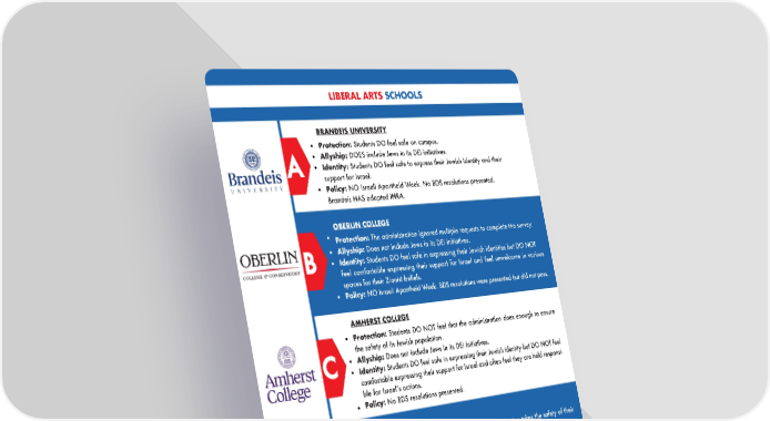 LIBERAL ARTS SCHOOLS BRANDEIS UNIVERSITY Protection: Students DO feel safe on campus. Allyship: DOES include Jews in its DEI initiatives. Identity: Students DO feel safe to express their Jewish identity and their A support for Israel. Policy: NO Israeli Apartheid Week. No BDS resolutions presented. Brandeis HAS adopted IHRA. OBERLIN COLLEGE Protection: The administration ignored multiple requests to complete the survey. Allyship: Does not include Jews in its DEI initiatives. B Identity: Students DO feel safe in expressing their Jewish identities but DO NOT feel comfortable expressing their support for Israel and feel unwelcome in various spaces for their Zionist beliefs. Policy: NO Israeli Apartheid Week. BDS resolutions were presented but did not pass. AMHERST COLLEGE Protection: Students DO NOT feel that the administration does enough to ensure the safety of its Jewish population. C Allyship: Does not include Jews in its DEI initiatives. Identity: Students DO feel safe in expressing their Jewish identity but DO NOT feel comfortable expressing their support for Israel and often feel they are held responsi- ble for Israelʼs actions. Policy: No BDS resolutions presented. WILLIAMS COLLEGE Protection: Students DO NOT feel that the administration takes the safety of their Jewish students seriously. D Allyship: Does not include Jews in its DEI initiatives. Identity: Students reported a hostile environment aimed at Jews masked as anti-Zionism and they DO NOT feel comfortable expressing their support for Israel. Policy: NO Israeli Apartheid Week. A BDS resolution was presented and passed. SWARTHMORE COLLEGE Protection: The administration ignored multiple requests to complete the survey. F Allyship: Does not include Jews in its DEI initiatives. Identity: Inconclusive as no students from the school participated in the survey. Policy: BDS resolutions were presented and passed. 5