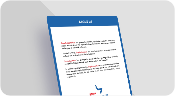 ABOUT US StopAntisemitism is a grassroots watchdog organization dedicated to exposing groups and individuals that espouse incitement towards the Jewish people and State and engage in antisemitic behaviors. Founded in 2018, StopAntisemitism was born in response to increasing antisemitic violence and sentiment across the United States. StopAntisemitism has developed a strong following, reaching millions of actively engaged individuals through social media, mailers, and its website. By publicly exposing antisemites, StopAntisemitism has created an environment where those who propagate hatred against the Jewish people are met with real-world consequences including but not limited to job loss, school expulsions, awards revoked, etc. Twitter: @StopAntisemites | Facebook: @StopAntisemitismorg Instagram: stop_antisemitism | Website: stopantisemitism.org 15