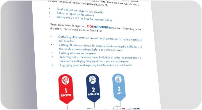 THE PROCESS STOPANTISEMITISM is an informational organization and serves as a resource to anyone who wants to stand up against hate. There are three ways in which people can report incidents of antisemitism 24/7: • Send a direct message on social media • Submit a report on the website • Anonymously call the StopAntisemitism hotline Once an incident is reported, STOPANTISEMITISM mobilizes. Depending on the situation, this includes but is not limited to: • Gathering all information around the circumstances to create a meaningful call to action • Vetting all relevant details for accuracy and ensuring that all the facts of the incident are consistent before any action is taken • Liaising with law enforcement • Reaching out to the educational institution of which the perpetrator is a member or notifying the perpetrator’s place of employment • Engaging press and exposing the information on social media WE HOLD ANTISEMITES ACCOUNTABLE