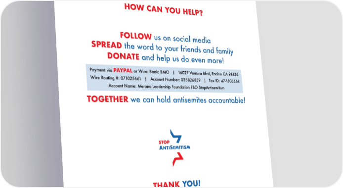 HOW CAN YOU HELP? FOLLOW us on social media SPREAD the word to your friends and family DONATE and help us do even more! Payment via PAYPAL or Wire: Bank: BMO | 16027 Ventura Blvd, Encino CA 91436 Wire Routing #: 071025661 | Account Number: 035826859 | Tax ID: 47-1603664 Account Name: Merona Leadership Foundation FBO StopAntisemitism TOGETHER we can hold antisemites accountable! THANK YOU!