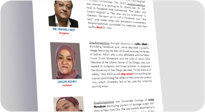 ACCOMPLISHMENTS -5- Dr. Manoj Sen is a surgeon at Northwick Park Hospital in London. On October 10th, 2023, StopAntisemitism was alerted to a posting by Dr. Manoj Sen. Dr. Sen took to Facebook and commented, "Die Juden sind unsere Unglück" or "the Jews are our misfortune" in German. He went on to call a Facebook user "Jew boy" and made other vile antisemitic commentary. StopAntisemitism contacted his employer and they swiftly fired Dr. Sen. DR. MANOJ SEN Surgeon StopAntisemitism brought attention to Lallia Allali's disturbing Facebook post, which depicted a graphic image featuring the Star of David severing the heads of babies. Allali, who is also affiliated with the Pales- tinian Youth Movement and the wife of Imam Taha Hassane of the Islamic Center of San Diego, was con- nected to numerous anti-Israel protests. In response, the University of San Diego decided, "In the interest of safety," that Allali would step away from teaching her course, prioritizing the safety of the university commu- LALLIA ALLALI nity, which ultimately led to her and the university Lecturer parting ways. StopAntisemitism was forwarded footage of Lucia Mendoza destroying posters of hostage Israeli chil- dren in New York City. She was quickly identified as a medical scribe at a facility in Clifton, New Jersey. After StopAntisemitism shared the footage to Twitter and alerted her employer, Mendoza was immediately terminated. LUCIA MENDOZA Medical Scribe