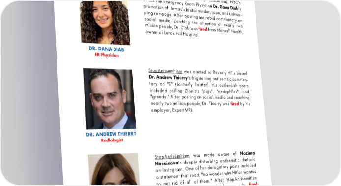 ACCOMPLISHMENTS -1- StopAntisemitism received a tip concerning NYC's Lenox Hill Emergency Room Physician Dr. Dana Diab's promotion of Hamas’s brutal murder, rape, and kidnap- ping rampage. After posting her rabid commentary on social media, catching the attention of nearly two million people, Dr. Diab was fired from Norwell Health, owner of Lenox Hill Hospital. DR. DANA DIAB ER Physician StopAntisemitism was alerted to Beverly Hills based Dr. Andrew Thierry's frightening antisemitic commen- tary on "X" (formerly Twitter). His outlandish posts included calling Zionists "pigs", "pedophiles", and "greedy." After posting on social media and reaching nearly two million people, Dr. Thierry was fired by his employer, ExpertMRI. DR. ANDREW THIERRY Radiologist StopAntisemitism was made aware of Nozima Husainova's deeply disturbing antisemitic rhetoric on Instagram. One of her derogatory posts included a statement that read, "no wonder why Hitler wanted to get rid of all of them." After StopAntisemitism alerted her employer, Citibank promptly fired Husainova and made a statement of condemnation. NOZIMA HUSAINOVA Finance