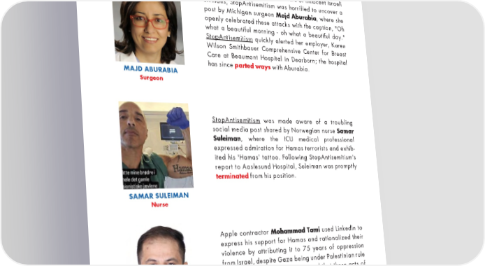 ACCOMPLISHMENTS -4- In light of the October 7th massacre of innocent Israeli civilians, StopAntisemitism was horrified to uncover a post by Michigan surgeon Majd Aburabia, where she openly celebrated these attacks with the caption, "Oh what a beautiful morning - oh what a beautiful day." StopAntisemitism quickly alerted her employer, Karen Wilson Smithbauer Comprehensive Center for Breast Care at Beaumont Hospital in Dearborn; the hospital has since parted ways with Aburabia. MAJD ABURABIA Surgeon StopAntisemitism was made aware of a troubling social media post shared by Norwegian nurse Samar Suleiman, where the ICU medical professional expressed admiration for Hamas terrorists and exhib- ited his 'Hamas' tattoo. Following StopAntisemitism's report to Aaslesund Hospital, Suleiman was promptly terminated from his position. SAMAR SULEIMAN Nurse Apple contractor Mohammad Tami used LinkedIn to express his support for Hamas and rationalized their violence by attributing it to 75 years of oppression from Israel, despite Gaza being under Palestinian rule since 2005. Mohammad reiterated that these acts of terror would persist until Palestine is liberated "from the river to the sea." This is a call for the destruction of Israel and its inhabitants. Similar to the termination of MOHAMMAD TAMI Natasha Dach, Apple promptly cut ties with Tami. Technology / Apple