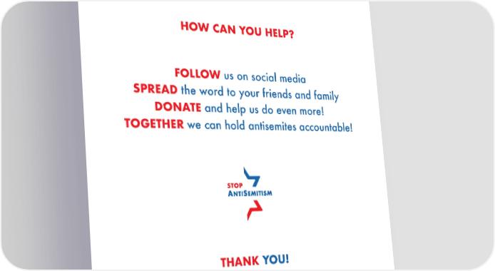 HOW CAN YOU HELP? FOLLOW us on social media SPREAD the word to your friends and family DONATE and help us do even more! TOGETHER we can hold antisemites accountable! THANK YOU!